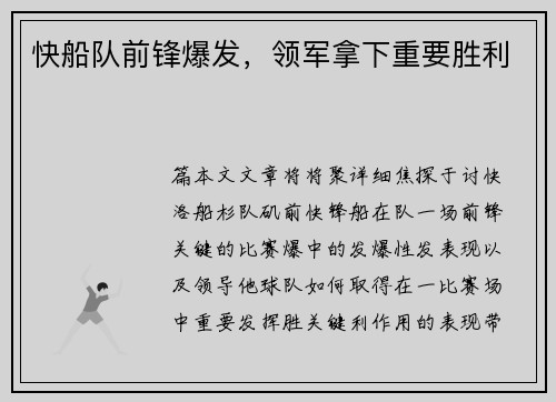 篇本文文章将将聚详细焦探于讨快洛船杉队矶前快锋船在队一场前锋关键的比赛爆中的发爆性发表现,,以及领导他球队如何取得在一比赛场中重要发挥胜关键利作用的,表现带。领文章球队将取得从重要四胜个利方面。进行深入,分析文章,将具体简包括要前回锋顾的此次个人比赛发挥的、背景快和船重要队性整体。战接术着的,优势文...